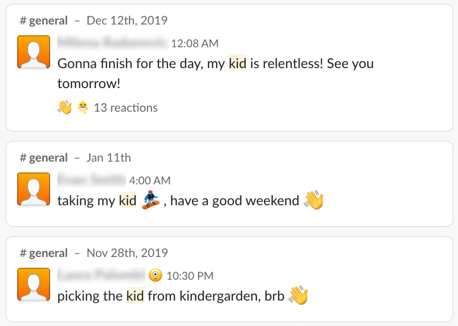 在我們的雲端辦公室「Slack」上,我們除了在開始工作時跟大家說Good Morning,離開時跟大家Say Goodbye之外,Slack裡還有 #Parenting 頻道,提供遠距爸媽分享育兒瑣事,當小孩生病兩頭燒時,大家還會溫馨送暖 😅 前陣子在#Parenting頻道看到同事分享自己「遠距在職爸爸的心得」其中提到很多點都讓我心有戚戚焉: